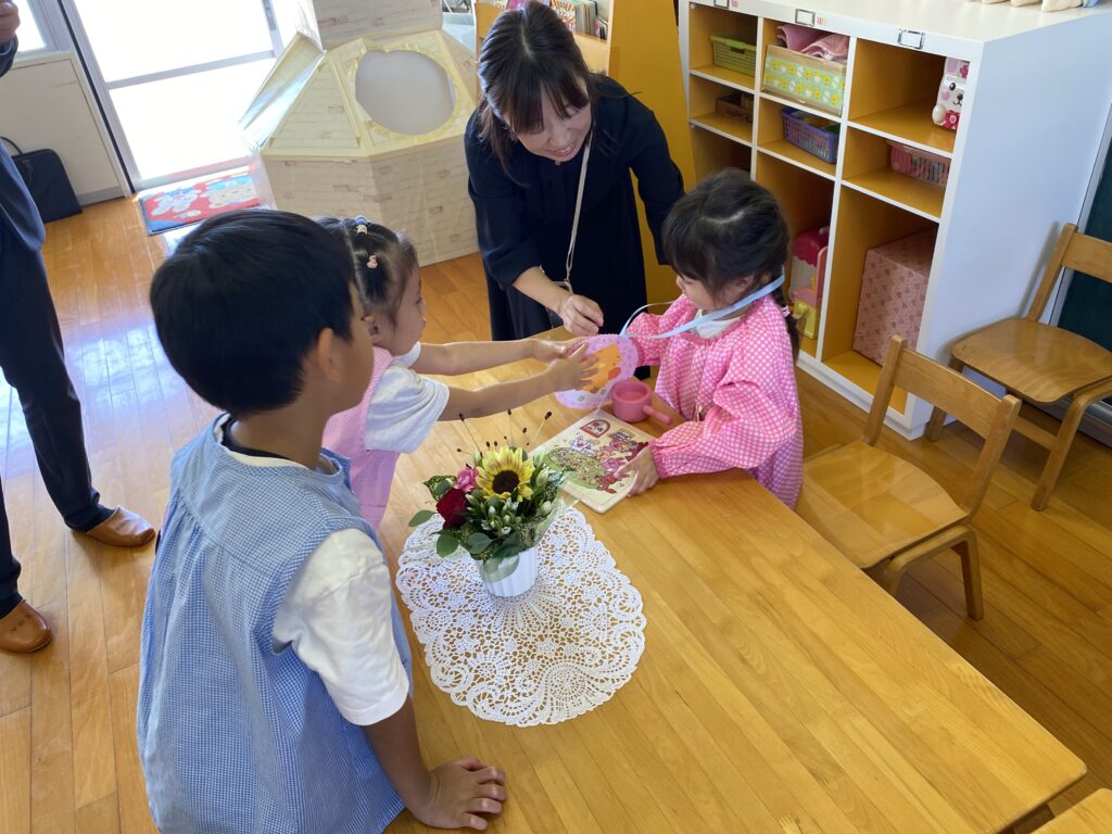 ひよこぐみ入園式 2025年10月01日 #トピックス 10月1日(水曜日) 満3歳組 ひよこ組の入園式 がありました。 年長児のお兄さんお姉さんがお祝いの メッセージカードやプレゼントで歓迎🎁 一緒に手遊びをして楽しい時間を 過ごしました♪ 明日からいっぱい元気に 遊ぼうね💕 音感教育2025年9月29日 関連記事 2022年05月20日 #トピックス クッキング・野菜スープ作り 5月20日金曜日、クッキングをしました。 年長組になって初めてのクッキング… […] 2025年01月17日 #トピックス お正月遊び 1月17日金曜日、年少児のお正月遊びの様子です。 カラフルな折り紙凧を作って […] 2024年05月31日 #トピックス 椅子取りゲーム 椅子取りゲームをしました。 ♪さんぽの曲に合わせていすの周りを歩きます。 ピ […]