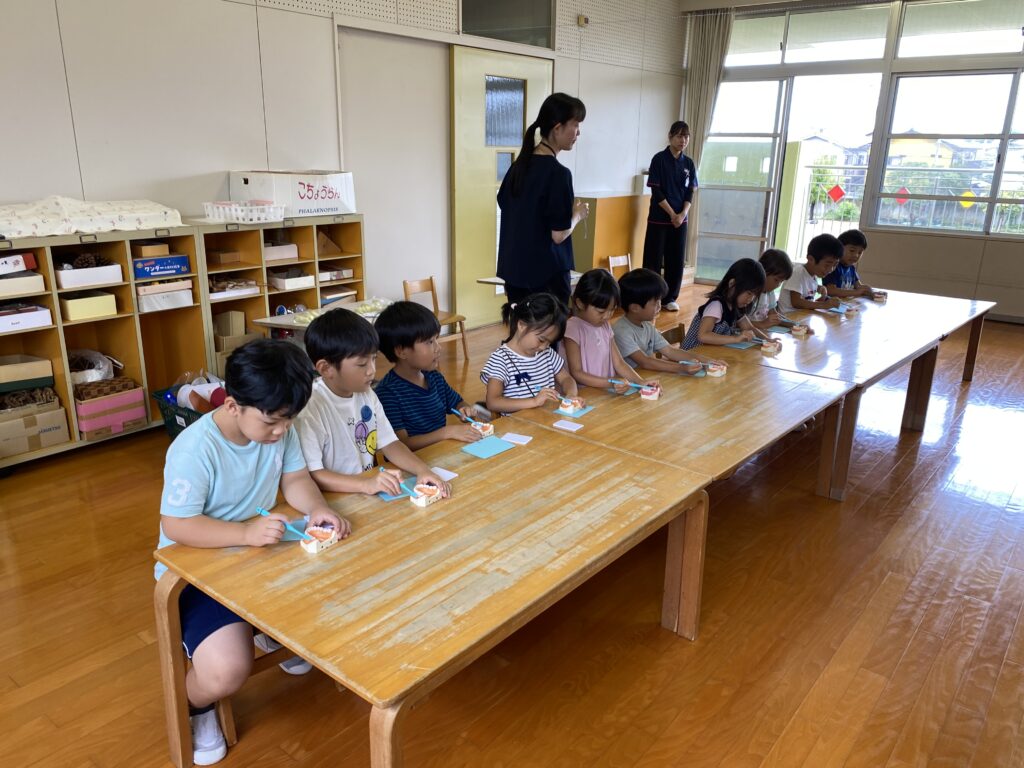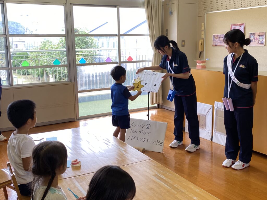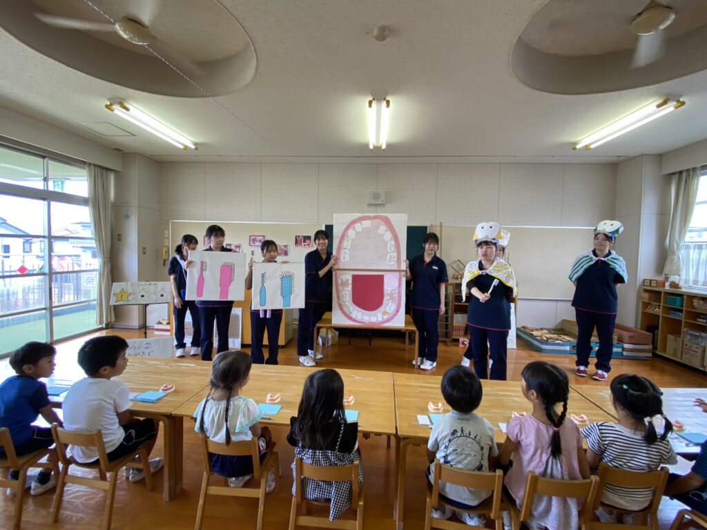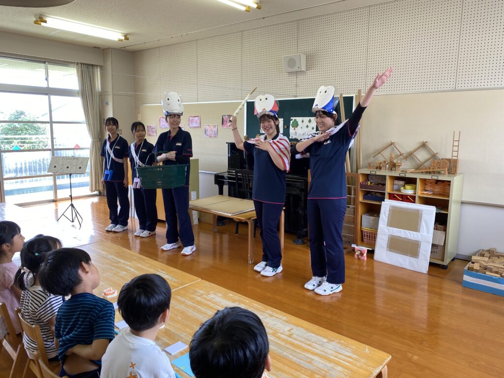 口腔保健実習 2025年10月16日 #トピックス 10月16日(木曜日) 口腔保健学科のお姉さんたちが、お口にいいことを 教えに来てくださいました。 歯についてのお話しも分かりやすくて 「歯を大切にしよう!」 っていう気持ちになったよね✨ 今度は磨いてみよう(^o^)/💪 みんな真剣! ていねいに磨いていたよ♪ ミッションクリアで2つ目の🌟ほしをもらったよ! 「すご~い!本当の歯医者さんと同じだあ」 磨き残しがないかチェックしてくれたよ。 口腔保健学科のみなさん、ありがとうございました🌟 運動会2025年10月12日カレー・サラダづくり2025年10月17日 関連記事 2023年12月01日 #トピックス 12月 満3歳児入園式 12月1日(金)12月 満3歳児入園式がありました。今日から、文理幼稚園に新 […] 2018年10月11日 #トピックス クッキング カレーサラダ作り 10月11日木曜日、年中組 年長組がクッキングをしました。 年中組は、サラダ […] 2025年10月07日 #トピックス ハサミであそんだよ 10月7日(火曜日) はさみで遊びました。 持ち方やはさみの扱い方は保育者が […]