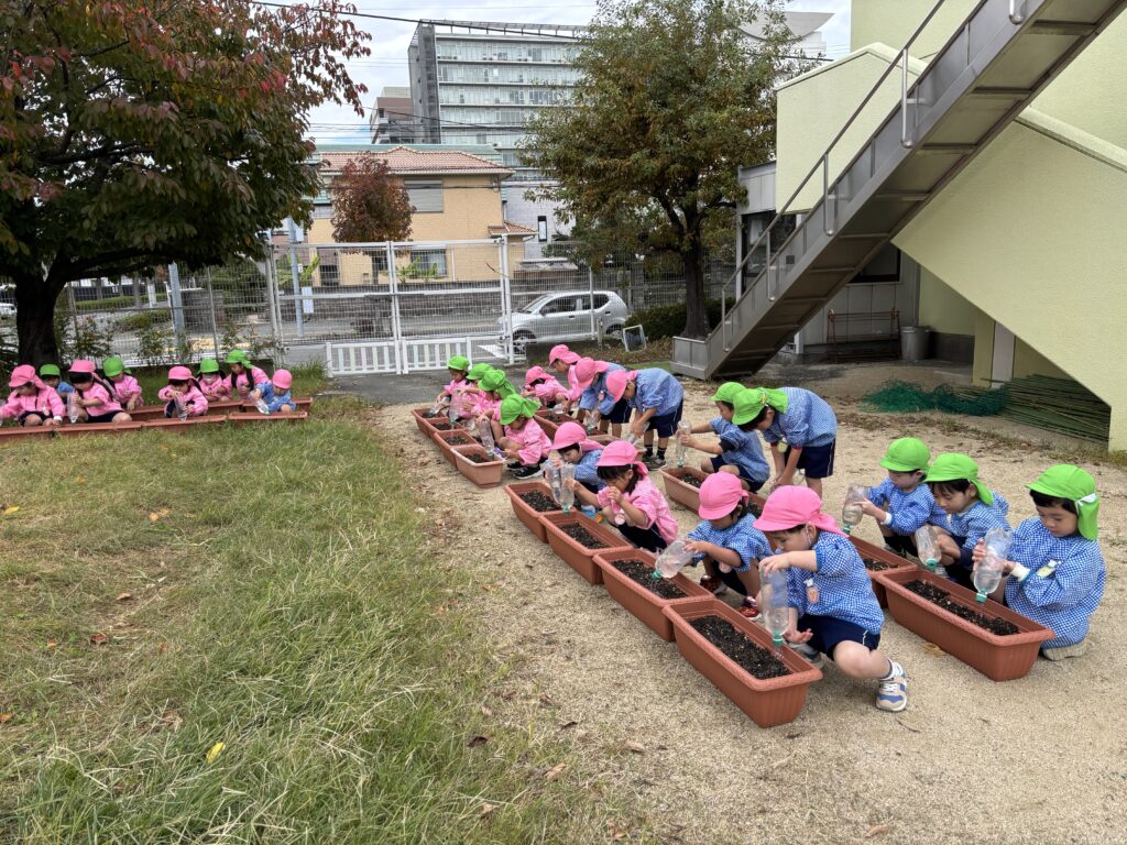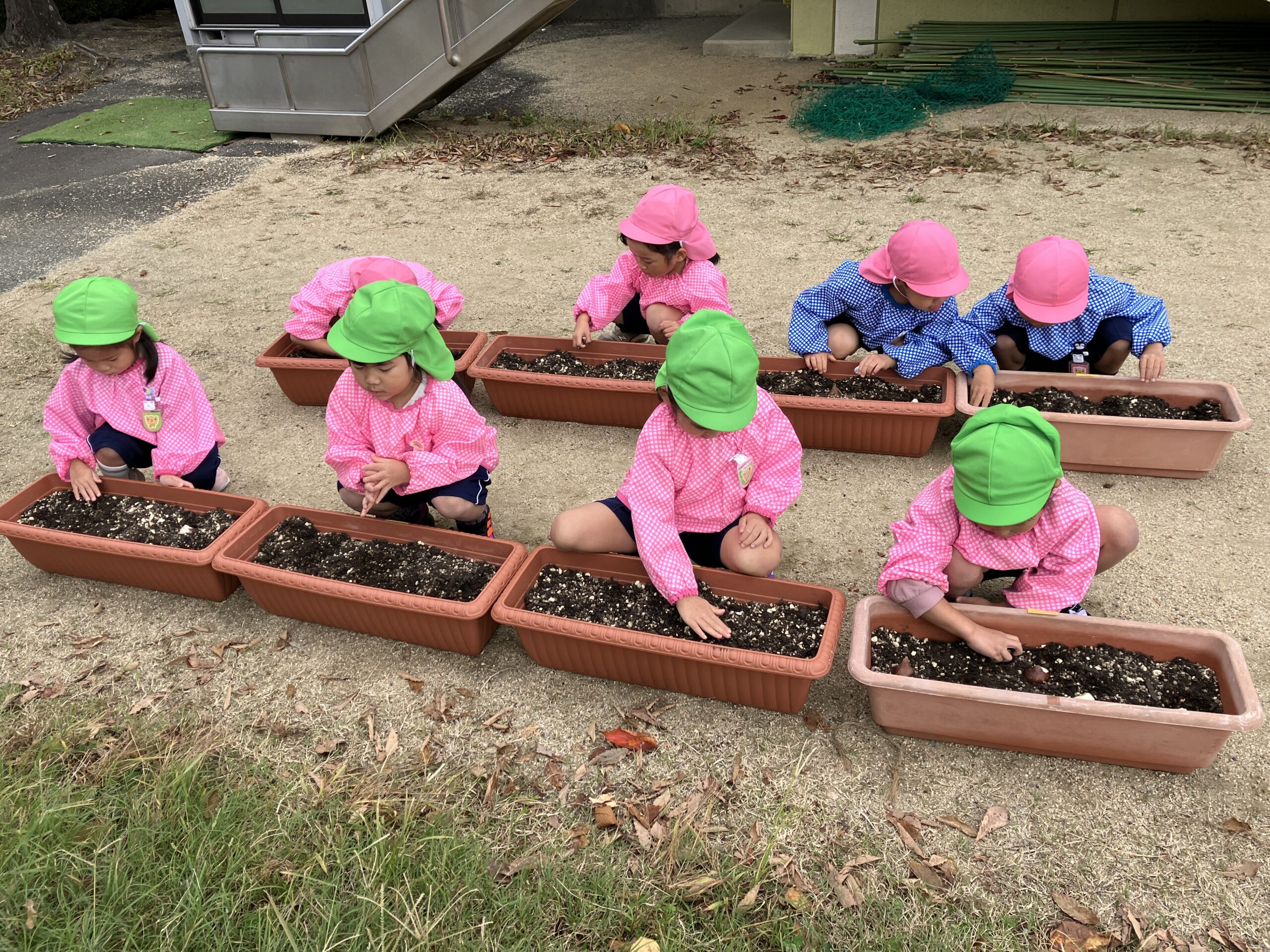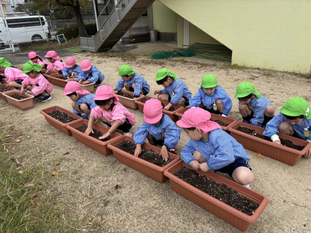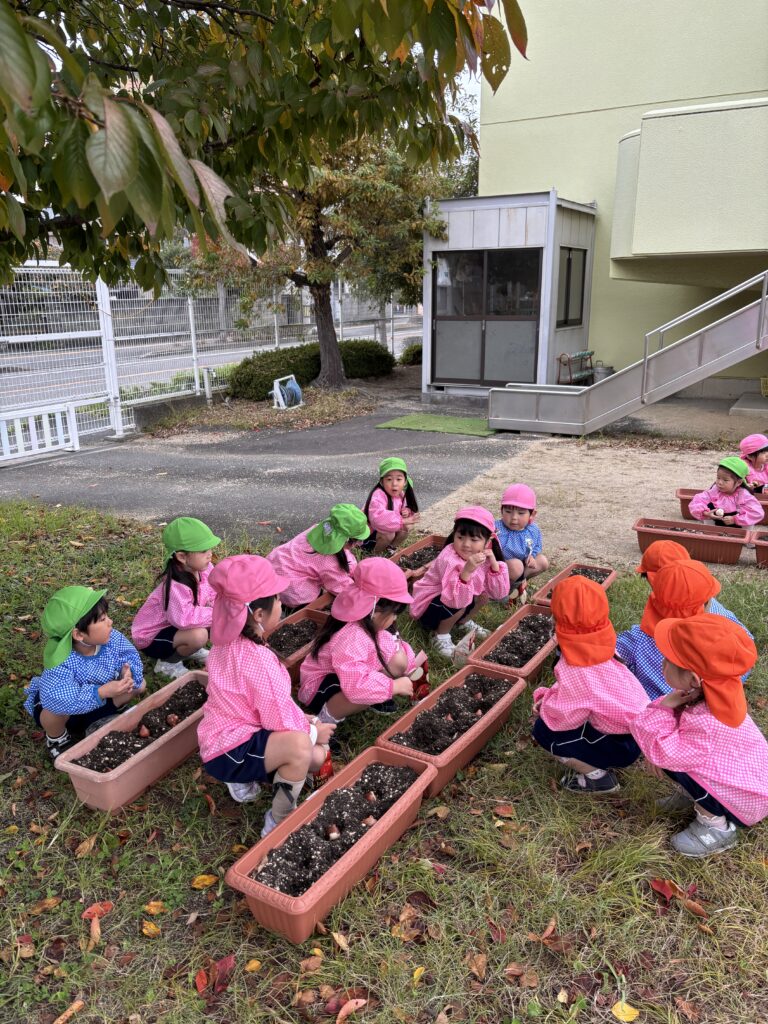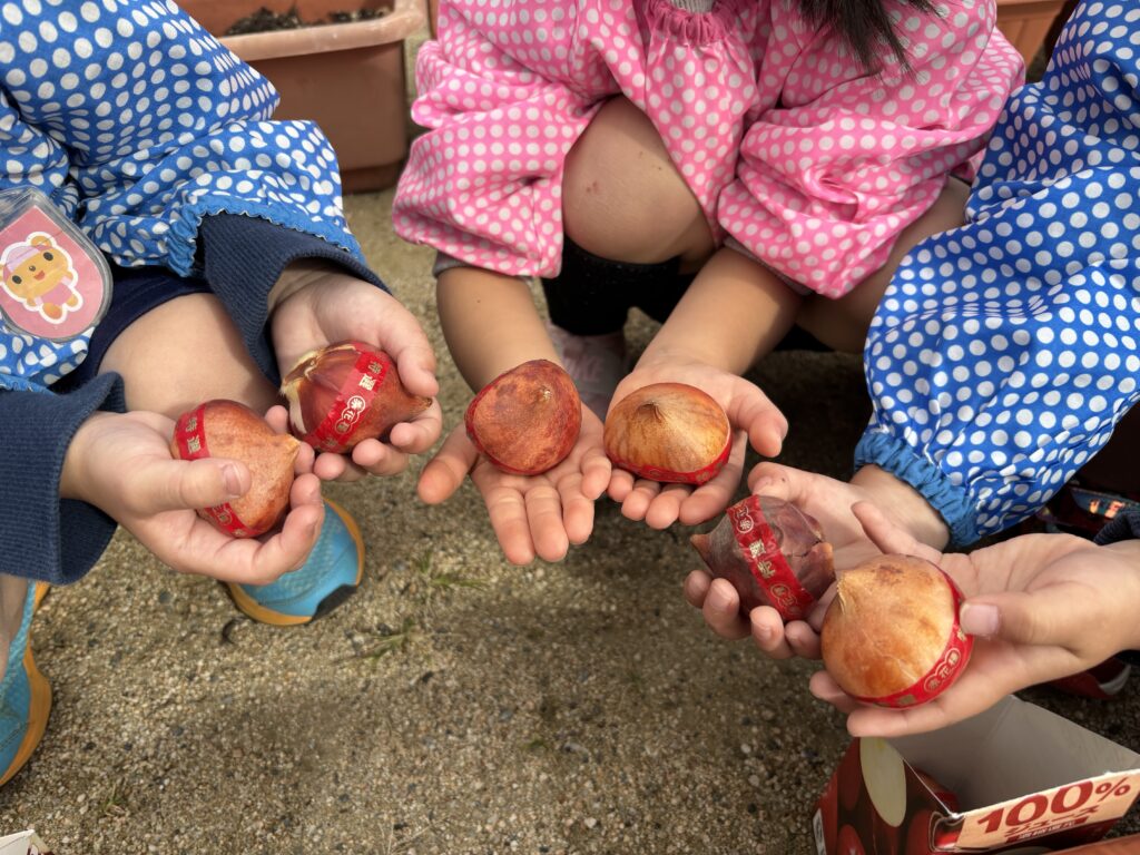 4歳児 ちゅうりっぷ球根植え 2025年11月12日 #トピックス 11月12日(水曜日) 年中組がちゅうりっぷの球根を植えました。 「玉ねぎみたい~!」 「ヒヤシンスの球根に似てる~」 と子どもたち。 球根を植えるための穴を掘って・・・。 やさしく球根を置いていくよ(*^_^*) そ~っと土のお布団をかぶせていこう! 「ちゃんと隠れた❓❗」 それからお水をあげました🚿 「いつ芽が出るかな?」 「みんなが大きい組になった時に咲く?」 赤、白、黄色のちゅうりっぷが咲くのを 楽しみにしています。 ままごとあそび2025年11月7日 関連記事 2025年01月18日 #トピックス 年長児・遊び 1月18日土曜日、年長児が遊んでいる様子です。 広い園庭で、元気に走り回りな […] 2021年10月16日 #トピックス 保護者講習会・ヨガコンディショニングストレッチ 10月16日土曜日、保護者会主催のヨガコンディショニングストレッチの講習会を […] 2024年11月07日 #トピックス おいもほり・おいもパーティー 11月7日(木曜日) おいもほり・おいもパーティーを しました。 大学の学生 […]