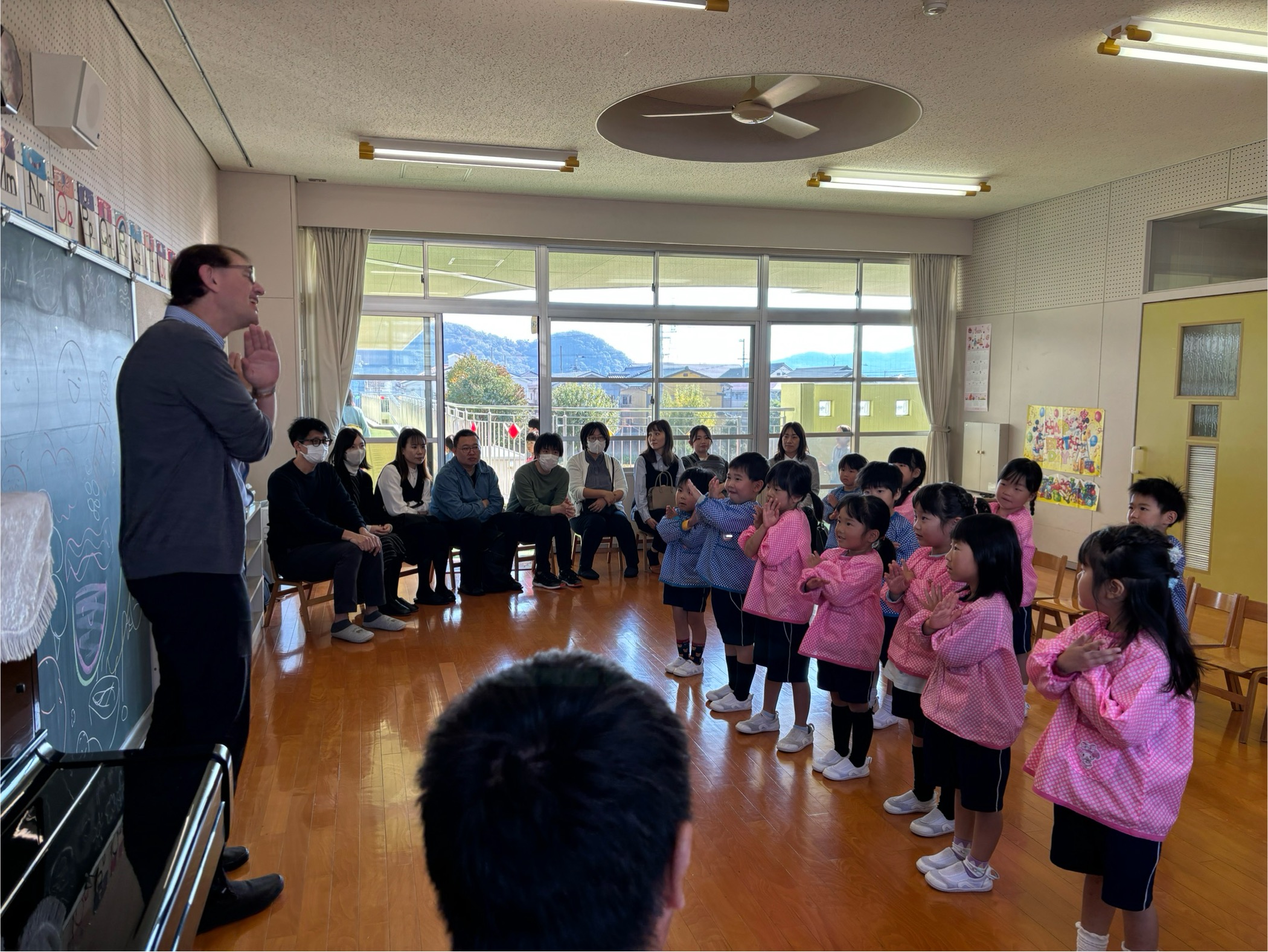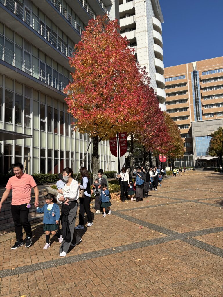 4歳児参観日 2025年11月17日 #トピックス 11月17日(月曜日) 4歳児 語感教育の参観日がありました。 初めは、ご挨拶の歌をリズムに合わせてやってみたよ🤗 先生の手の打ち方、すごく見てる👀 “すっごくうれしい~💓✨” を表現すると・・・子どもたちも、お家の人も 先生もみ~んな笑顔になっちゃった(*^_^*) 参観日の後は、大学の避難場所を確認してきました👇 おいも掘り・おいもパーティー2025年11月14日 関連記事 2021年11月15日 #トピックス 特設保育の参観日③ 11月15日月曜日、特設保育・英語の参観日を行いました。 さあ、Englis […] 2022年05月20日 #トピックス クッキング・野菜スープ作り 5月20日金曜日、クッキングをしました。 年長組になって初めてのクッキング… […] 2021年10月16日 #トピックス 保護者講習会・ヨガコンディショニングストレッチ 10月16日土曜日、保護者会主催のヨガコンディショニングストレッチの講習会を […]