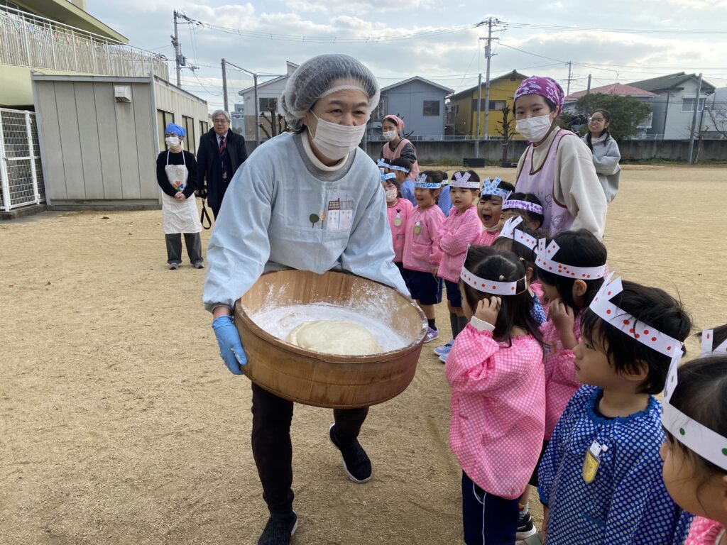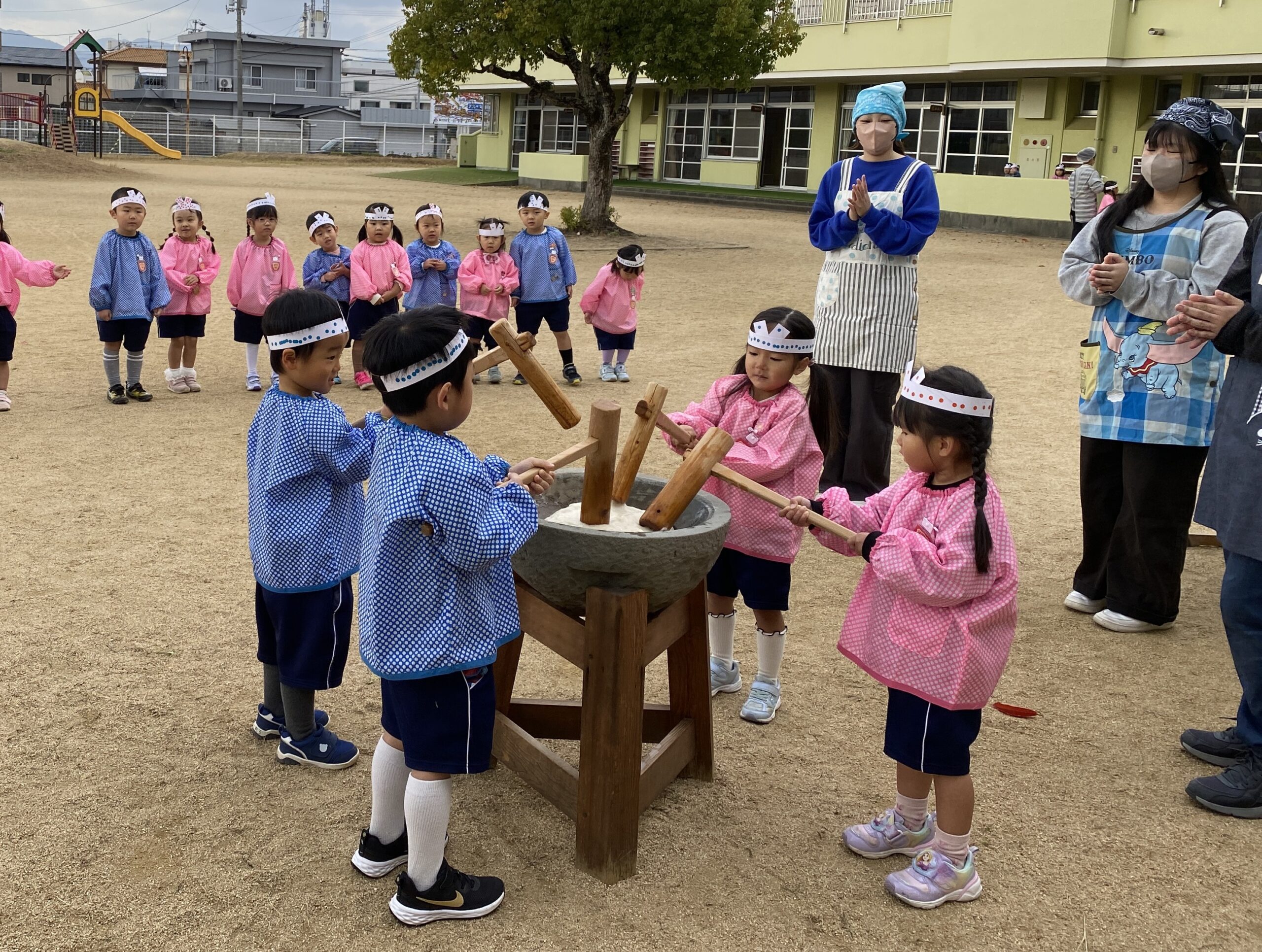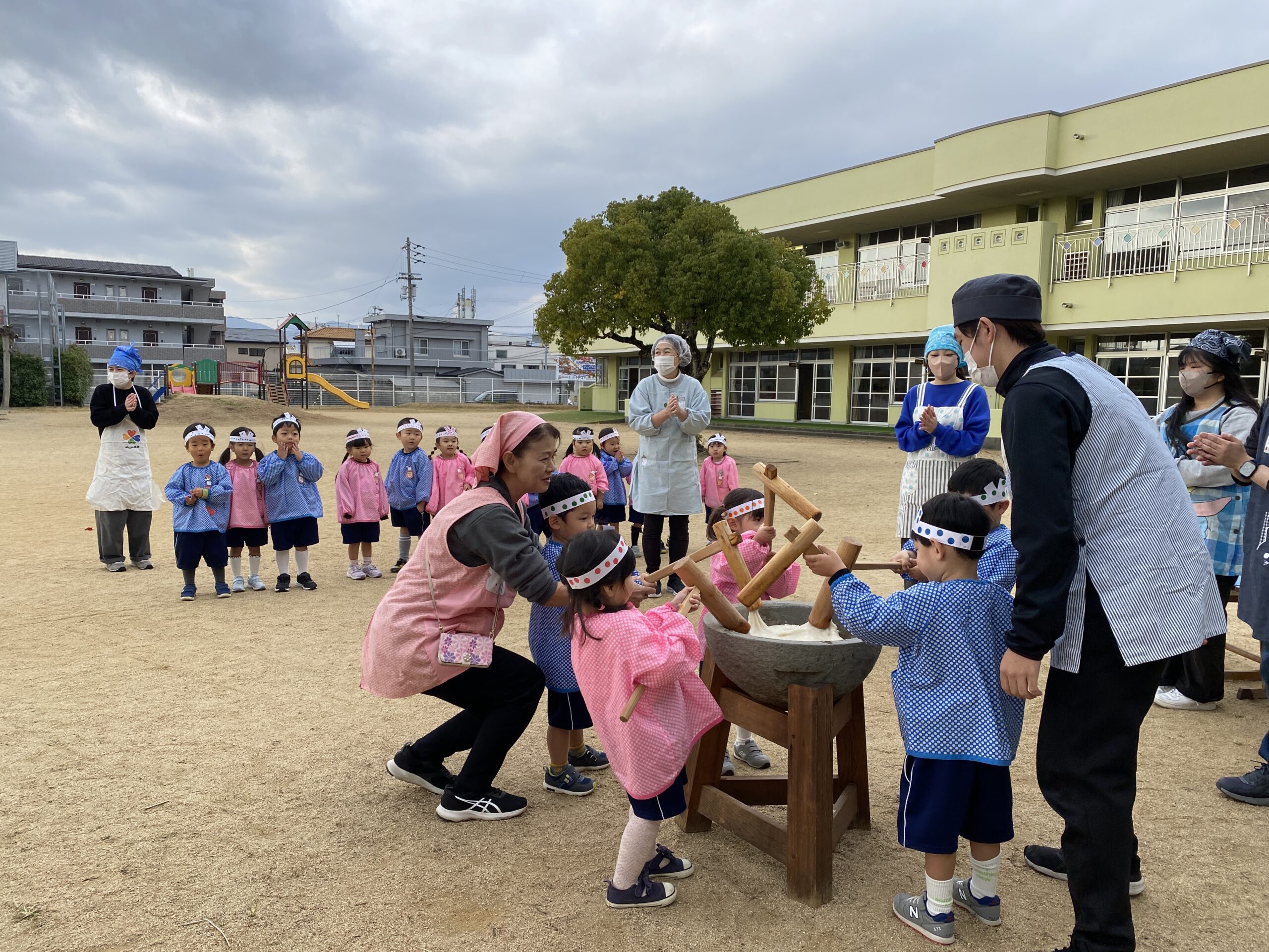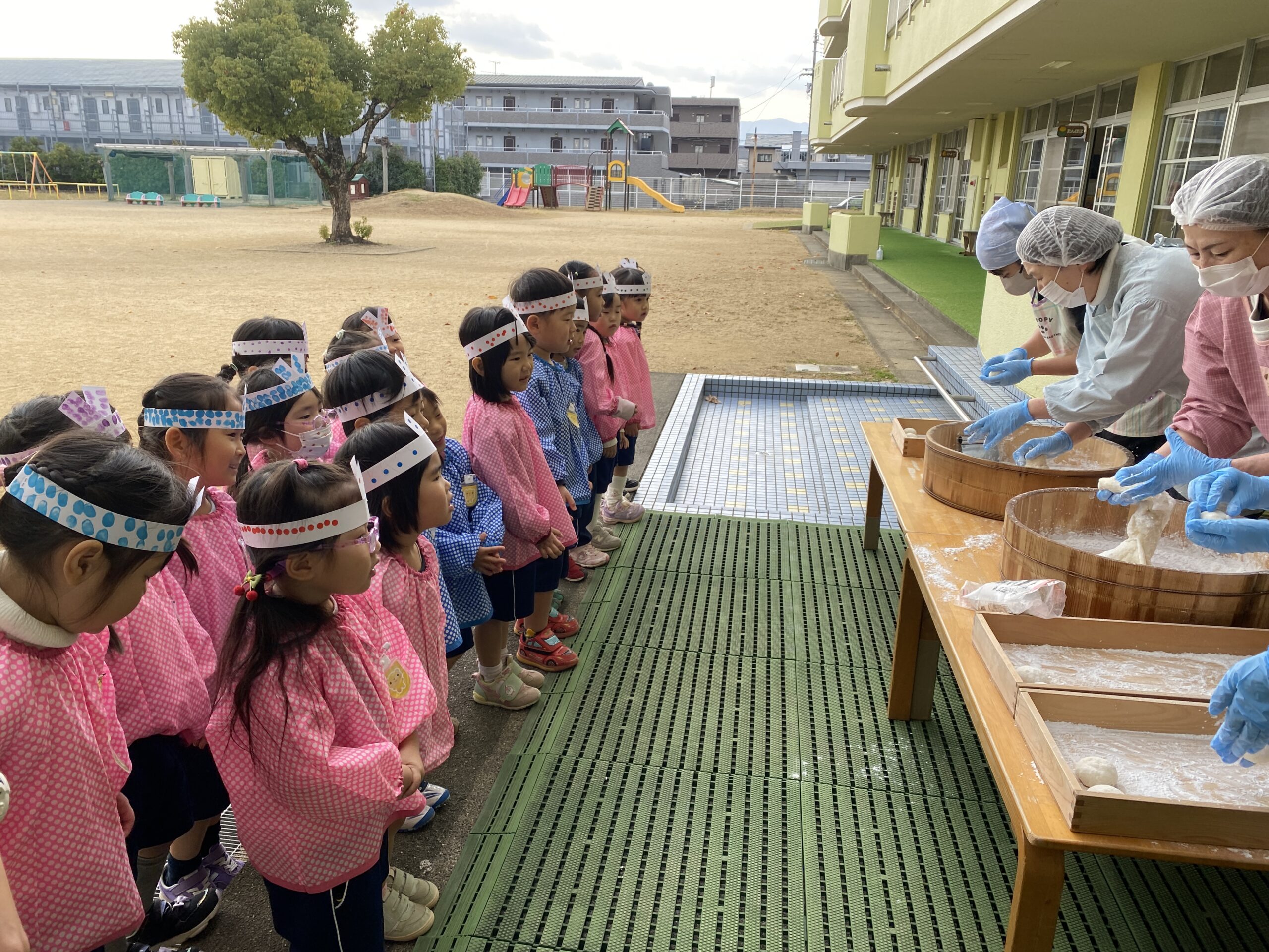 おもちつき 2025年12月03日 #トピックス 12月3日(水曜日) 楽しみにしていた おもちつきの日でした😊 ぺったんぺったん❗ 豆しぼりをつけると、力も入るよ💪 文理大学児童学科の学生さんが応援に かけつけてくださいました。 園長先生が、つき終えたおもちを見せてくれたよ。 ここから、小さなおもちに分けていくんだって(*^_^*) 「うわ~~おもちがすっごく伸びるね💓 年長児さんはふわふわのおもちを丸めたよ✨ 「あったか~い🤗」 やわらかくって気持ちいい~~(*^o^*) お家に帰って火を通して食べようね♪ おもちつき準備2025年12月1日 関連記事 2025年03月19日 #トピックス 第51回修了式 3月18日火曜日、第51回修了式が幼稚園リズム室で行われました。 村崎理事長 […] 2023年10月23日 #トピックス ハロウィンパーティー 10月23日(月)年中組のうさぎぐみ・りすぐみで少し早めのハロウィンパーティ […] 2024年10月15日 #トピックス 園庭で鬼ごっこ 10月15日(火曜日) 年中児が、園庭で鬼ごっこをして 遊んでいました。 タ […]