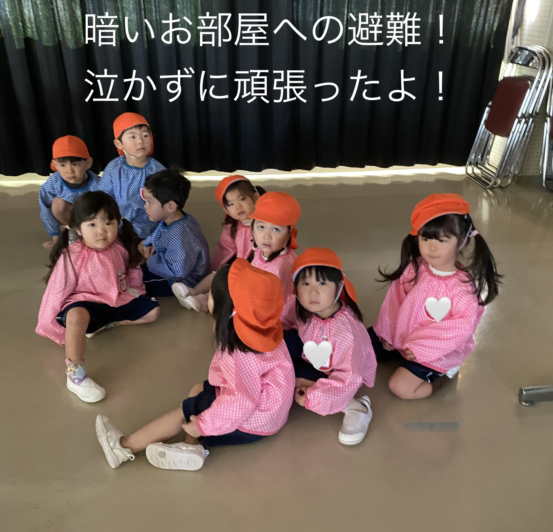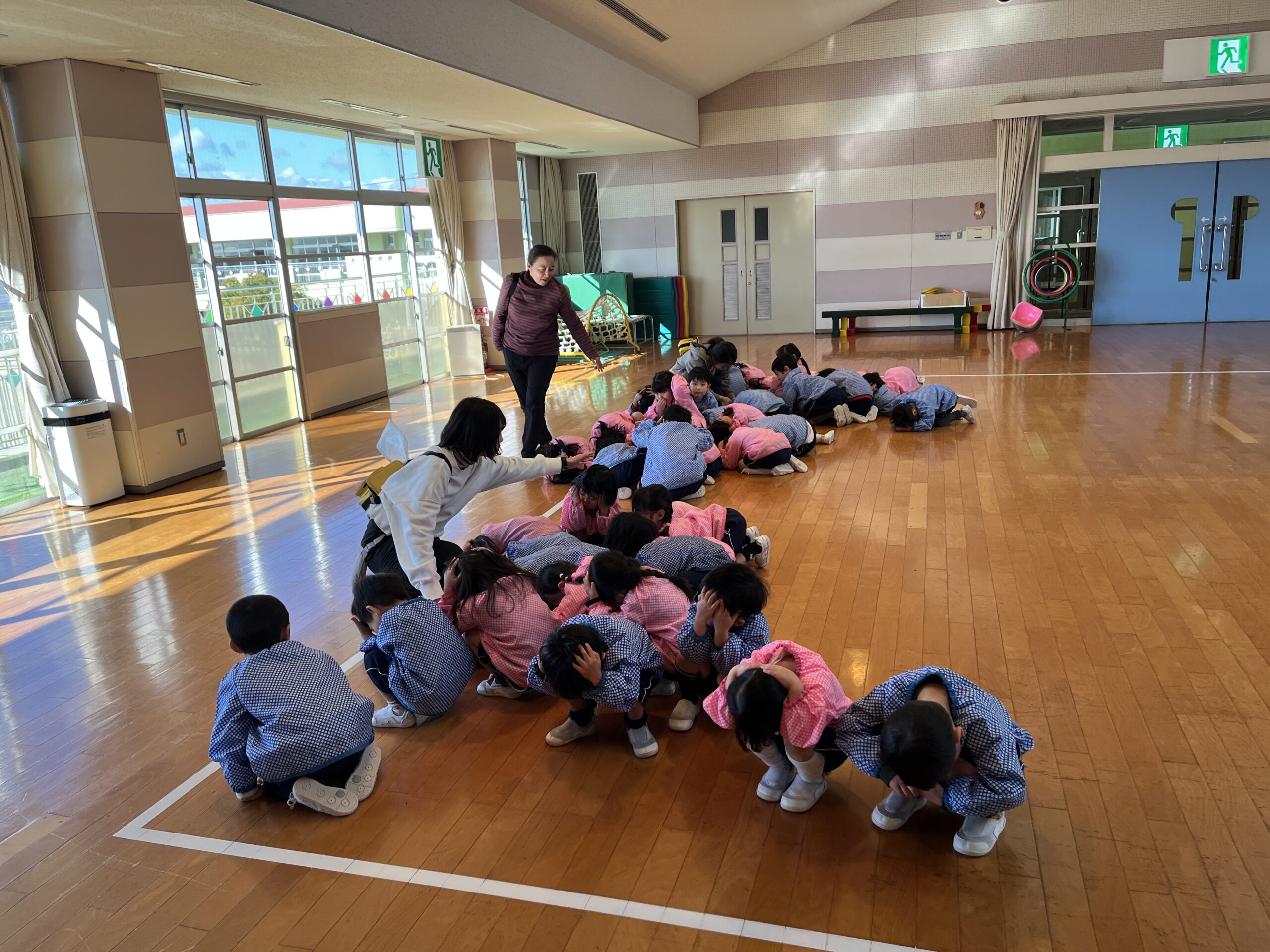避難訓練 2026年01月23日 #トピックス 1月23日(金曜日) 避難訓練をしました。 しっかり自分で歩いて避難するよ。 暗いお部屋もみんなといっしょなら大丈夫❗ 「リズム室で地震が起きたらどうしたらいい❓❗」 「ものが落ちてこない広いとこ」 「そうだね」 こうして、いっしょに考えたよ🤔 揺れが収まった後、園庭に避難しました。 地震ビデオを見た後、普段の姿を振り返ったよ。 避難の時しゃべったり、ふざけたり していないかな? 友だちと話すといつもの自分を 考えるきっかけになりました🤔 これからも自分で考え、友だちと話し合い、 いざという時に備えていこうね。 テニピンあそび2026年1月21日誕生会2026年1月24日 関連記事 2018年10月25日 #トピックス ハロウィンパーティー 10月25日木曜日、ハロウィンパーティーをしました。 文理大学のお兄さんお姉 […] 2024年09月30日 #トピックス 語感教育 9月30日(月曜日) 語感教育がありました。 久しぶりの語感教育! カナダか […] 2024年11月09日 #トピックス 製作 11月9日(土曜日) 年長組の製作活動の様子です✄ 「おいもの […]