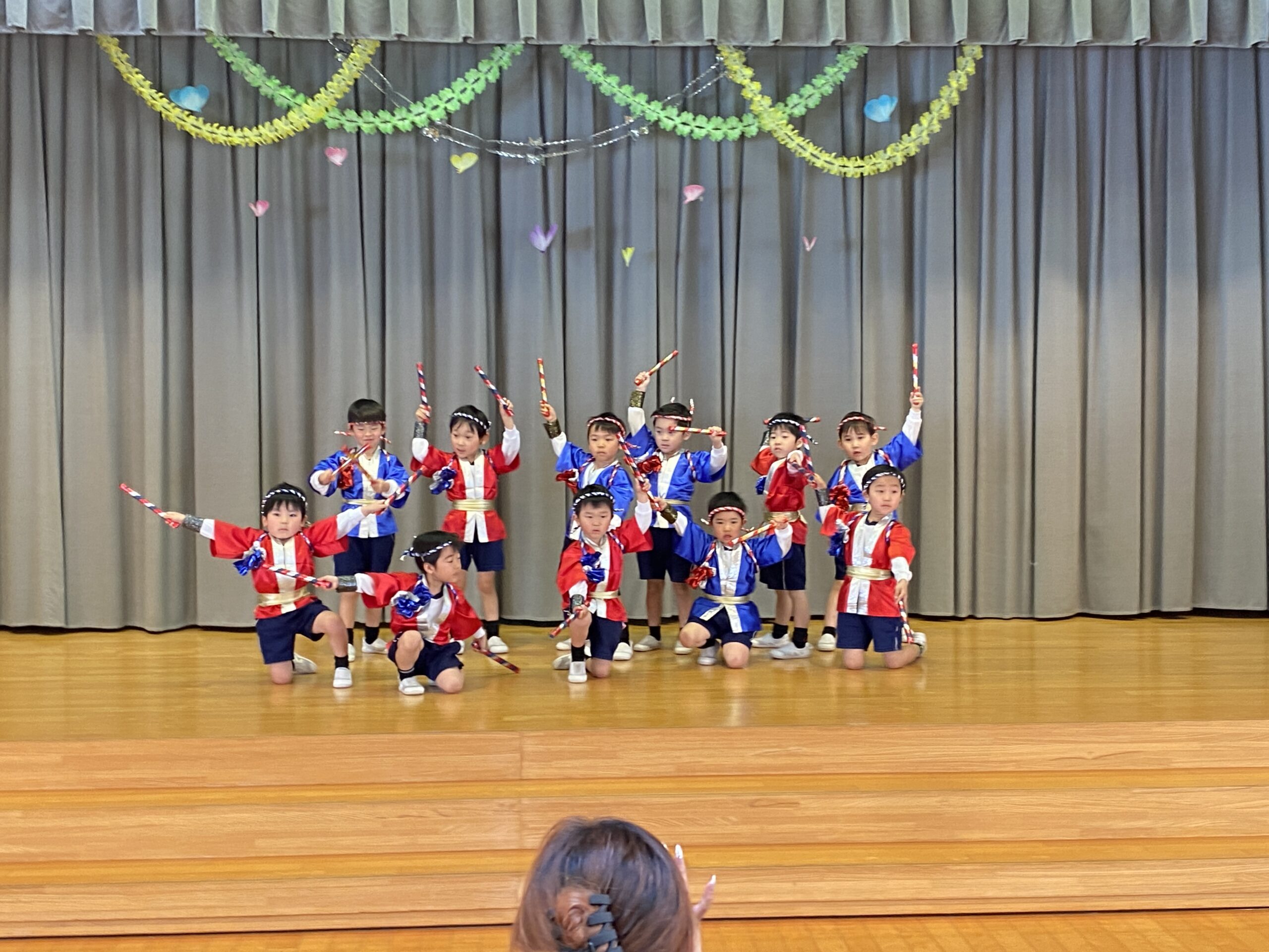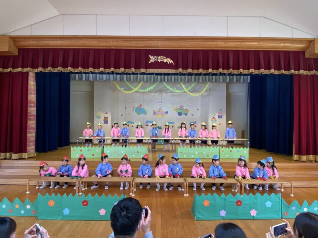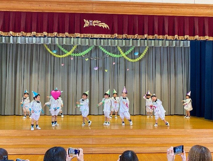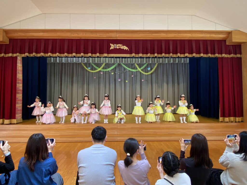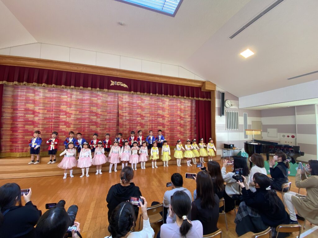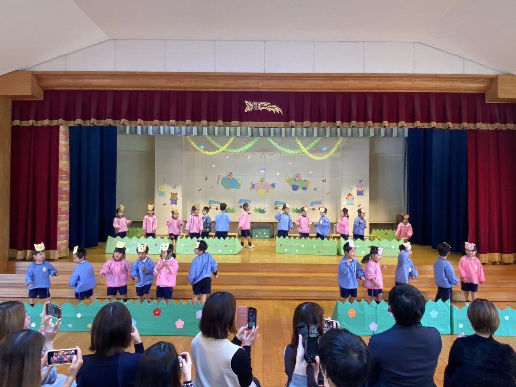 3.4歳児表現会 2026年02月28日 #トピックス 2月28日(土曜日) 3.4歳児の表現会がありました。 フィンガータップは音を合わせてタップ、タップ👐 たくさんのお客様に囲まれ、 うれしすぎてドキドキ していた子どもたち💓 かわいいところを観てね👀 ぼくたちのバチさばき、ビシって決まっているでしょ❓❗ 最後までやりきった姿を観てもらうことが出来ました♪ 温かい拍手👏は、子どもたちのパワーになっていました💪 みんな、一歩一歩成長したね✨ 文理大学村崎ホールコンサート2026年2月27日 関連記事 2020年06月22日 #トピックス やまももの収穫 6月22日月曜日、年長組が、園庭に実ったやまももを収穫しました。 木を揺する […] 2019年07月17日 #トピックス 上棟式 7月16日火曜日 文理大学 トレーニングセンターの上棟式に行きました。 お餅 […] 2018年05月26日 #トピックス 避難訓練 5月26日土曜日、避難訓練をしました。 「緊急地震速報が入りました!」みんな […]